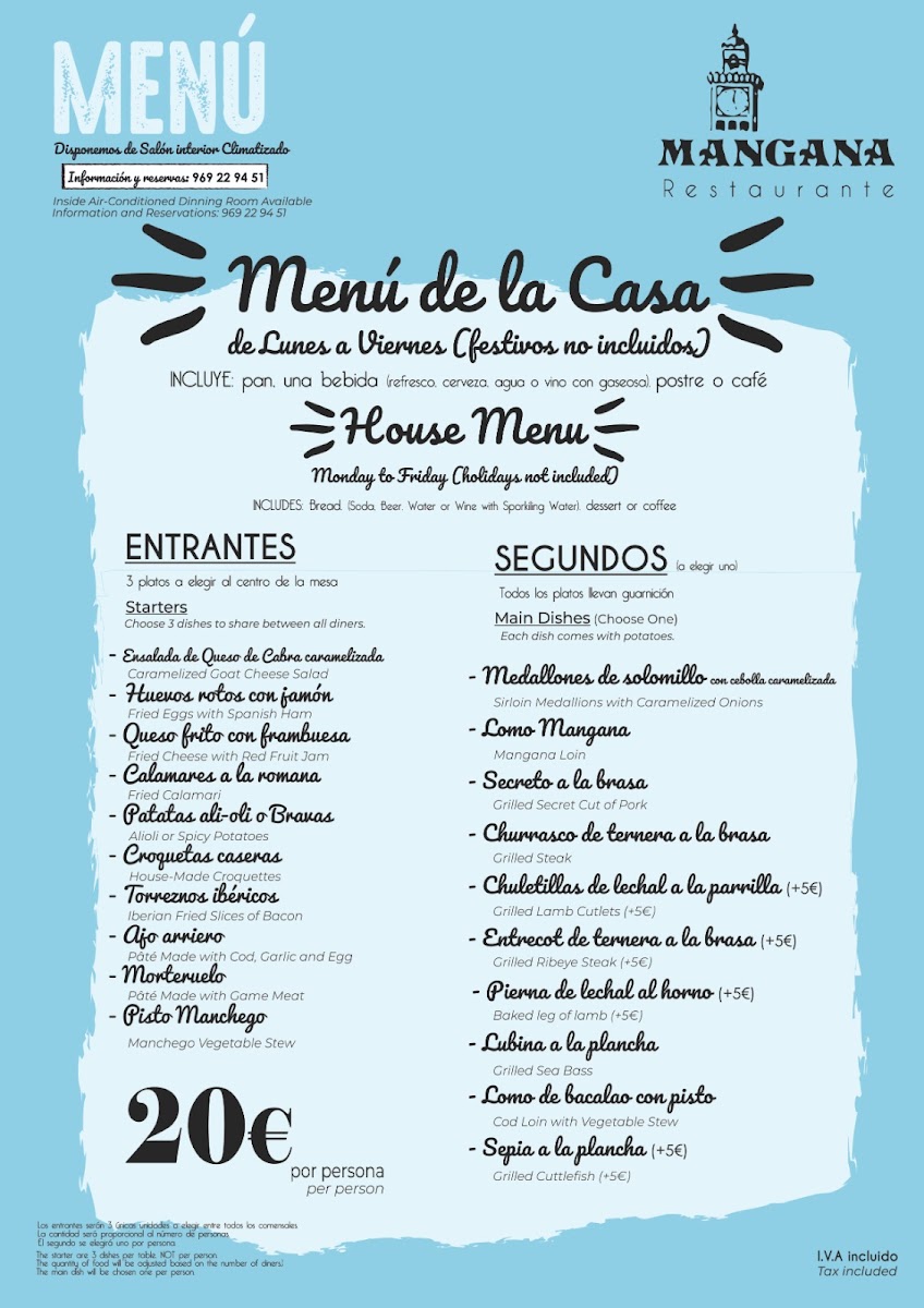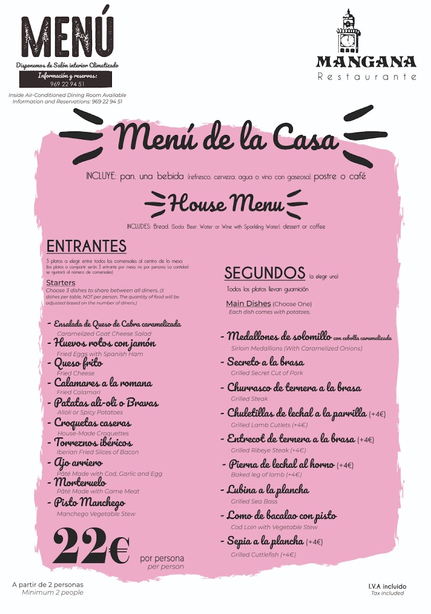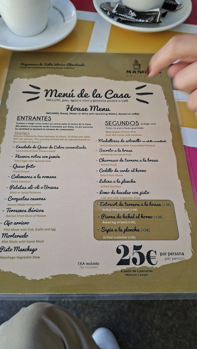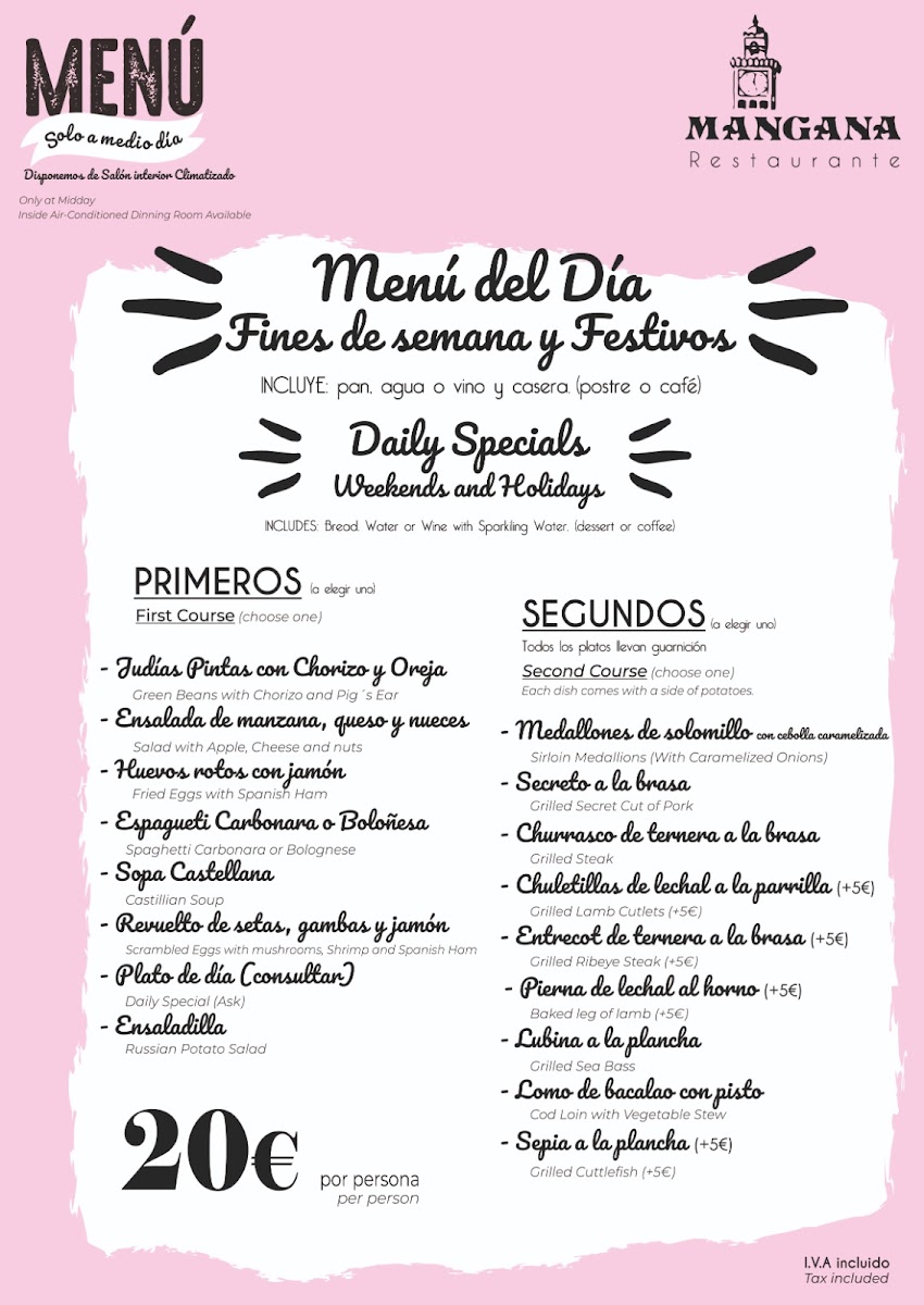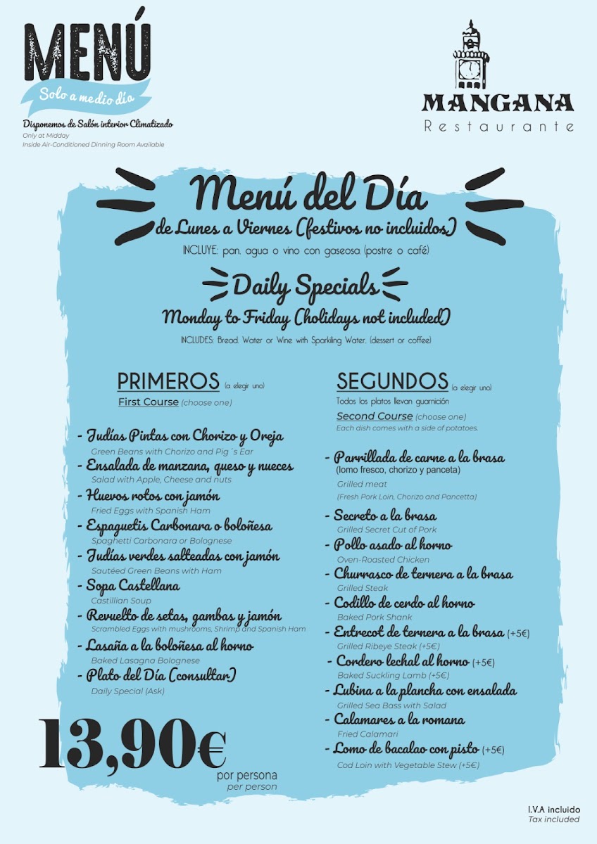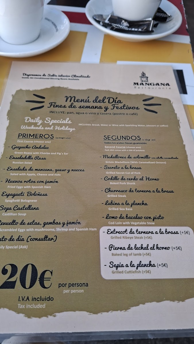 Introducing the menu at Restaurante Mangana, a hidden gem nestled in the heart of Cuenca, Spain. This vibrant establishment, located at Pl. Mayor, 3, offers an enticing Menu del Día for just €13.90, featuring a delightful selection of appetizers, main courses, and desserts, all paired with fresh bread and wine. Patrons rave about the incredible variety, including flavorful gazpacho, savory Angus beef burgers, and tender chicken dishes cooked to perfection.